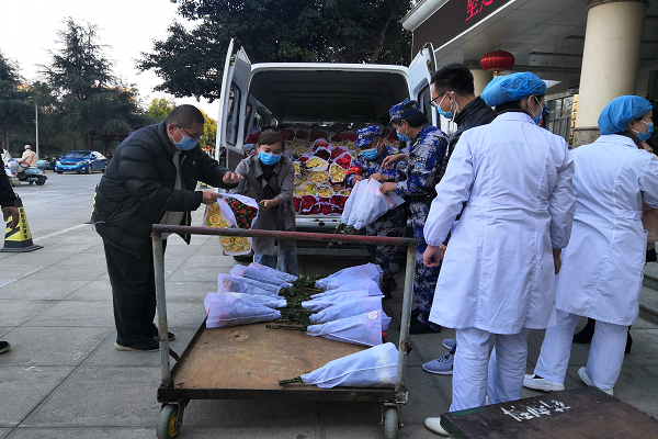 大家踏着晨露,忙碌于鲜花大棚中。剪切下近万枝红的、粉的、黄的玫瑰花,修剪整理包装好,800束玫瑰花束及时送到了一线医护人员手中,感谢“抗疫天使”护佑人民,祝福他们健康归来!