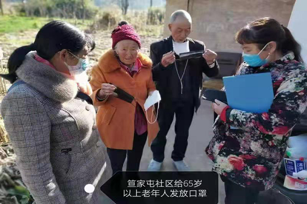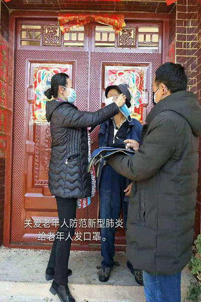 上3图:计生协人员参与深入农户为65岁以上老年人发放口罩和宣传如何配戴口罩。