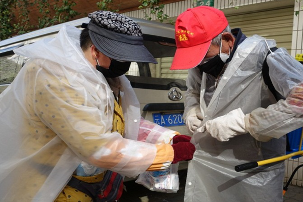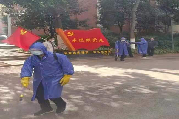 盘龙区鼓楼街道桃源社区计生协志愿者开展消毒前准备。