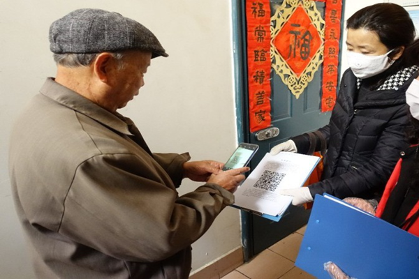 盘龙区鼓楼街道桃源社区计生协工作人员动员老年人加入疫情防控宣传微信群。
