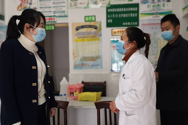 嵩明县卫健局局长、计生协常务副会长陈琪在村卫生室询问防疫工作情况。