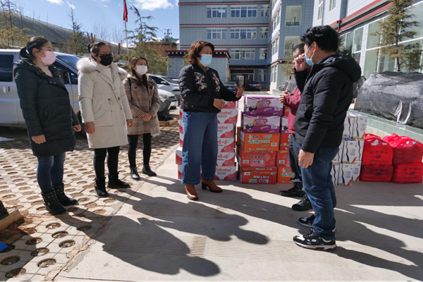 2月11日下午,迪庆州计生协党支部书记、常务副会长木丽琼,副会长兼秘书长斯那卓玛一行,为迪庆州藏医院、迪庆州疾病预防控制中心的疫情防控一线医务人员送去了价值1万元的方便面、矿泉水、牛奶、湿纸巾等急需生活物资,并对抗战在疫情防控一线的白衣战士致以亲切的问候,对大家的辛勤付出及无私奉献表示衷心感谢和崇高的敬意。