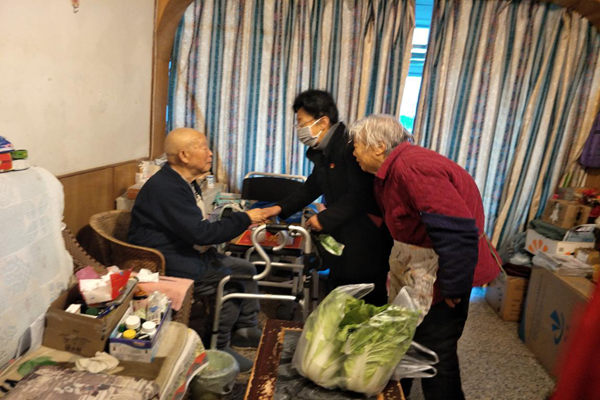当来到空巢老人伍昌义家中,二老分别都是82、83岁高龄,儿女又都在外地工作回不来,当陈书记把两袋时鲜蔬菜递给两位老人时,老人一边流泪一边激动的说:“谢谢政府、谢谢社区,在这样的时刻还能想着我们,真是太谢谢您们了。这几天您们也辛苦了,不仅上门给我们宣传疫情防控知识,送口罩、送消毒品,让我们出门有保障,在家里也能消毒净化空气,现在还给我们送新鲜蔬菜。生活在这样的社区,我们感到很幸福!”