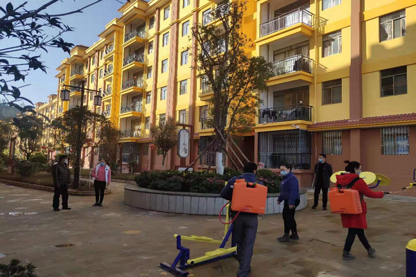 (镇计生协成员配合社区到小区等公共区域劝说外出人员回家,给公共区域消毒)